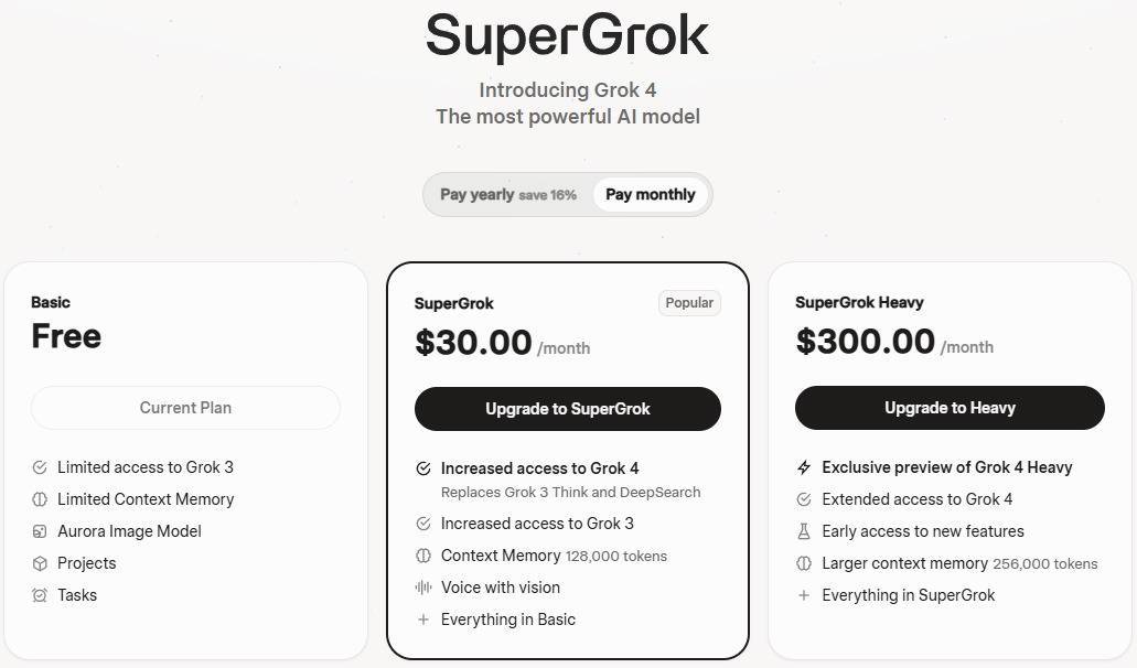 GrokGrok Heavy 即 Grok 最高级订阅服务,每月收费 300 美元(IT之家注:现汇率约合 2161 元人民币),相比 SuperGrok 订阅多了 Grok 4 新功能预览权限,以及最大 256,000 tokens 的上下文长度。