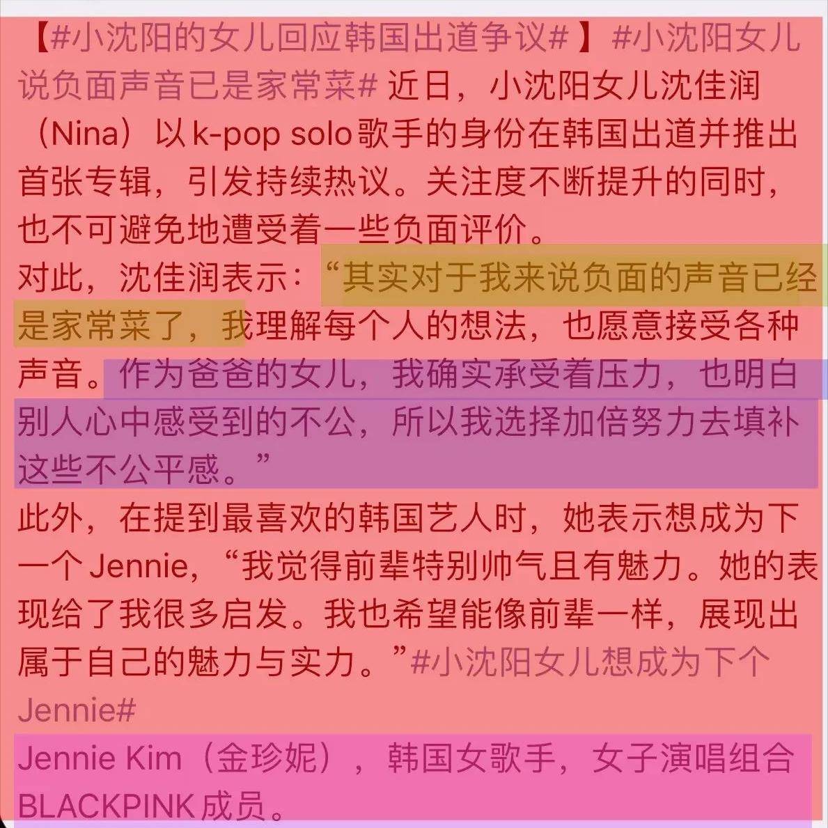 勇敢追梦从那个节目之后每次提到她都是不太好的声音,小沈阳两口子尽可能的降低女儿的出镜率,害怕外界的声音伤害到女儿,没想到女儿长大之后的梦想竟然是做唱跳歌手,因为韩国女子组合的金珍妮是沈佳润的偶像。