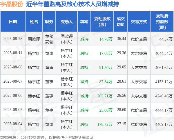 宇晶股份近半年内的董监高及核心技术人员增减持详情如下: